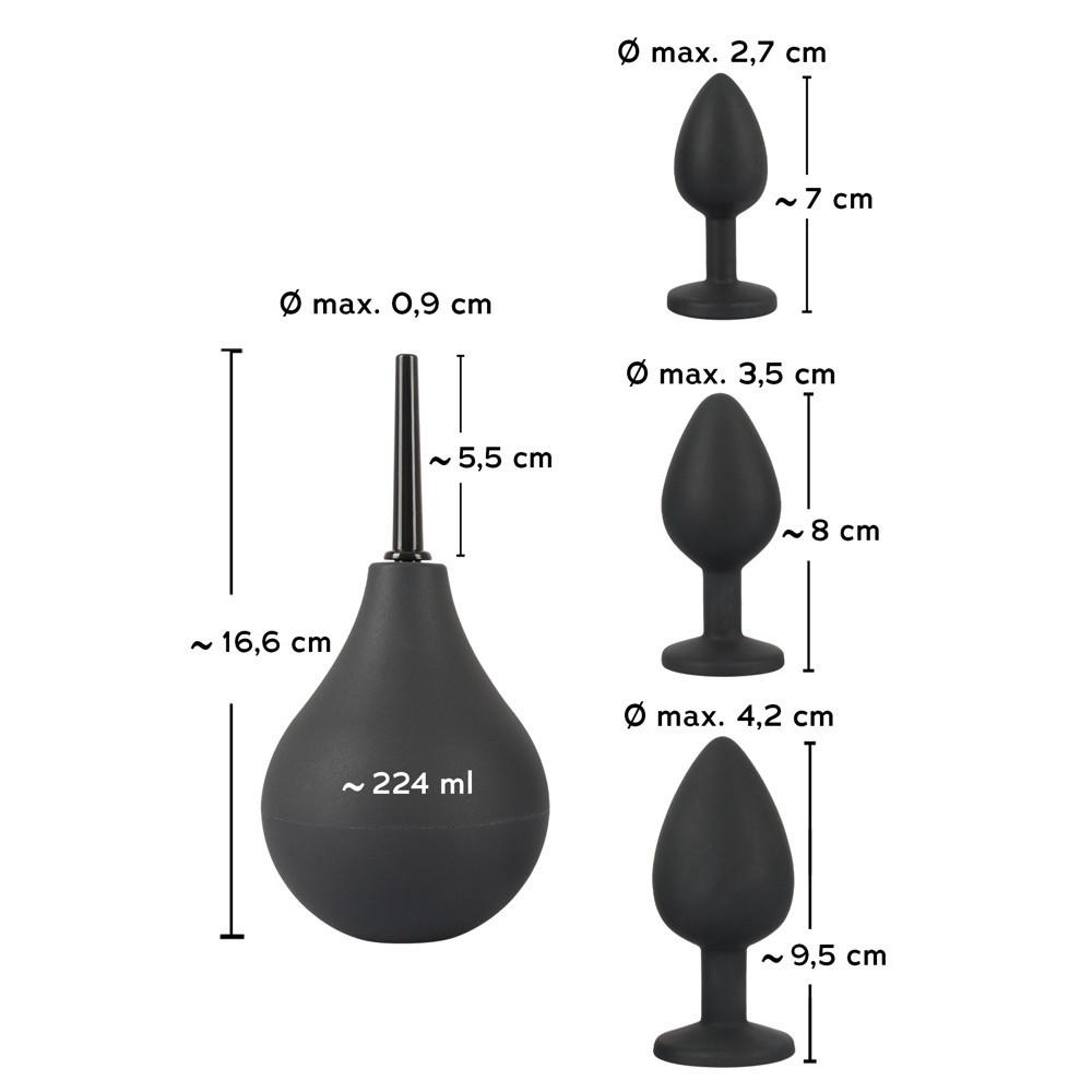 1 x анальный душ для подготовки, очистки и чудесных ощущений от сквиртинга. Ширина: 16,6 см, длина вставки: 5,5 см, диаметр трубки от 0,7 до 0,9 см, объем жидкости: 224 мл.