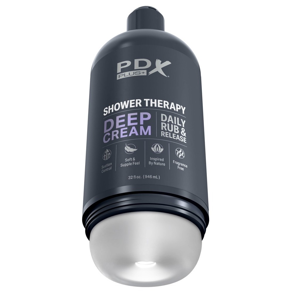 Мастурбатор Shower Therapy Deep Cream от PDX Plus снаружи выглядит как обычная бутылка шампуня. Однако под нижней крышкой скрывается узкий канал удовольствия с возбуждающей текстурой, идеально подходящий для интенсивного массажа пениса во время мастурбации. Замок бутылки работает как механизм контроля всасывания, позволяя легко регулировать ощущения при открытии или закрытии.