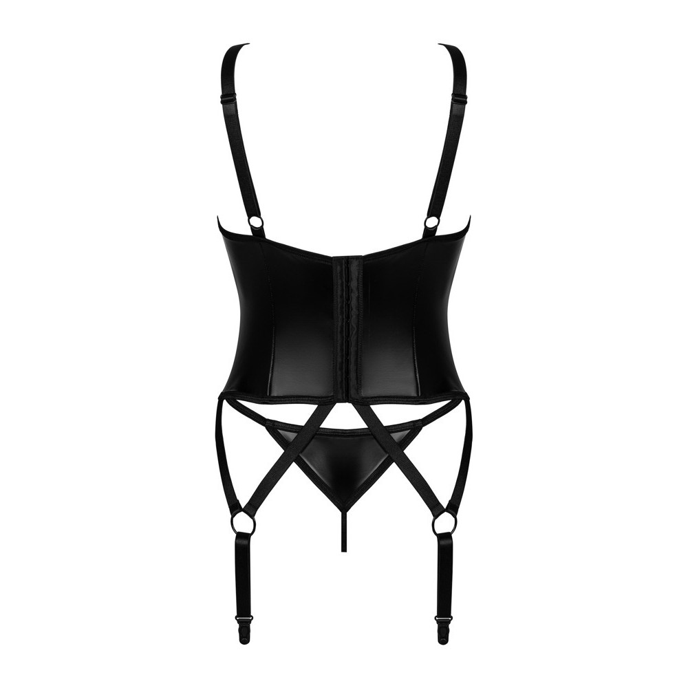 Комплект Armares от Obsessive включает в себя корсет с подвязками и идеально сидящие стринги в современном мокром стиле, эластичные и мягкие. Чашки с косточками имеют соблазнительные вырезы и небольшие ювелирные элементы. Бретели и ремешки для подвязок с умными кольцами полностью регулируются, как и застежка-крючок на спине.