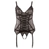 Черный корсет-топ из поуэрнета и кружева, с бретелями бюстгальтера и четырьмя регулируемыми резинками. Застежка-крючок сзади. В комплекте черные кружевные стринги без промежности в тон.