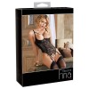 Соблазнительный боди-стринги с регулируемыми и съемными бретелями из кружева и слегка уплотненным бюстгальтером с застежкой-крючком на спине. С изящными деталями на бретелях и изысканными стразами в области декольте. Полупрозрачные кружевные вставки спереди создают соблазнительный вид. Сверху имеются дополнительные изящные бантики с серебристыми кольцами и эластичными лентами. Промежность полностью открыта и также украшена возбуждающими деталями в виде бретелей и стразов.