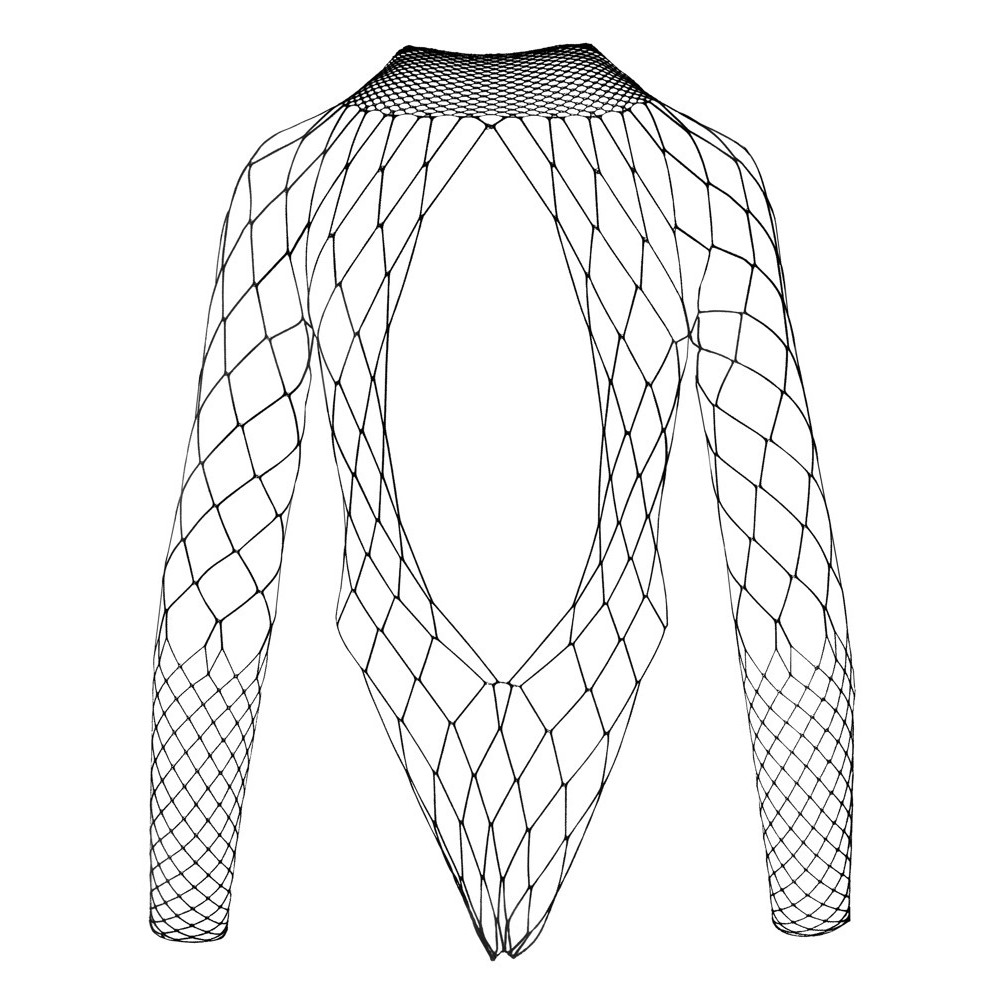 Этот боди выполнен из эластичной сетчатой ткани, что создает смелый и захватывающий дух образ, а открытая промежность придает ему ещё более провокационный вид. Воротник и рукава выполнены из более тонкой сетки, что придает изделию контраст и элегантность. Боди также выделяется большим вырезом на спине и высоким вырезом на ногах, который удлиняет силуэт и подчеркивает изгибы тела.