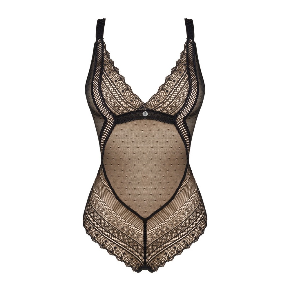 Боди Estiqua черного цвета соблазняет своим женственным и элегантным кроем. Слегка прозрачный материал стимулирует воображение, а мягкие треугольные чашки подчеркивают грудь и декольте. Имеет регулируемые бретели, застежку сзади и изысканную кружевную отделку. Открытая спина добавляет провокационный штрих, а эластичный материал обеспечивает комфорт и свободу движений.
