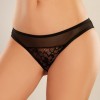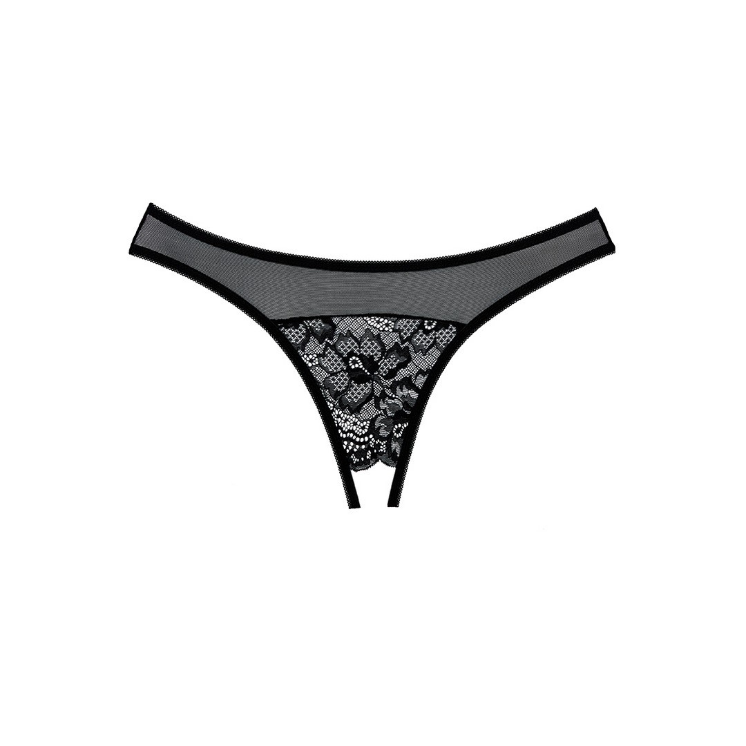 В этих греховно эротичных трусиках без промежности с коварно открытой спиной фантазия следует за слухами. Нежное кружево целует и спереди, и сзади, а по всему периметру его прикрывает полоска прозрачной сетки.