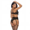 Комплект из трех частей: бюстгальтер с завязками, трусы с высокой талией и пояс с подвязками из цветочного кружева.