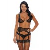 Комплект из трех частей: бюстгальтер с V-образным вырезом, пояс с подвязками и стринги из нежной сетки и кружева.