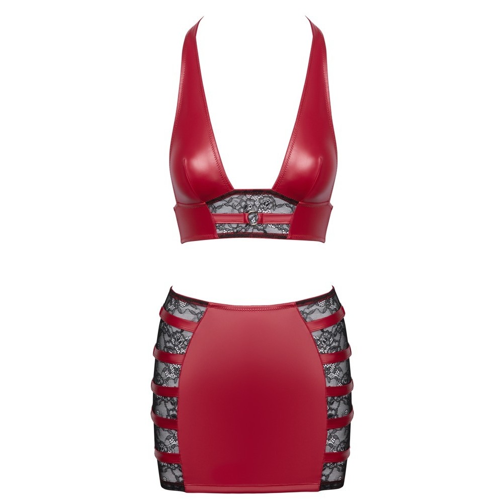 Обтягивающая юбка и топ с вырезом халтер в комплекте от Cottelli PARTY. Обе детали изготовлены из красивого красного материала с мокрым эффектом, с вставками из черного кружева и элегантными бретелями с серебряными кольцами на верху.