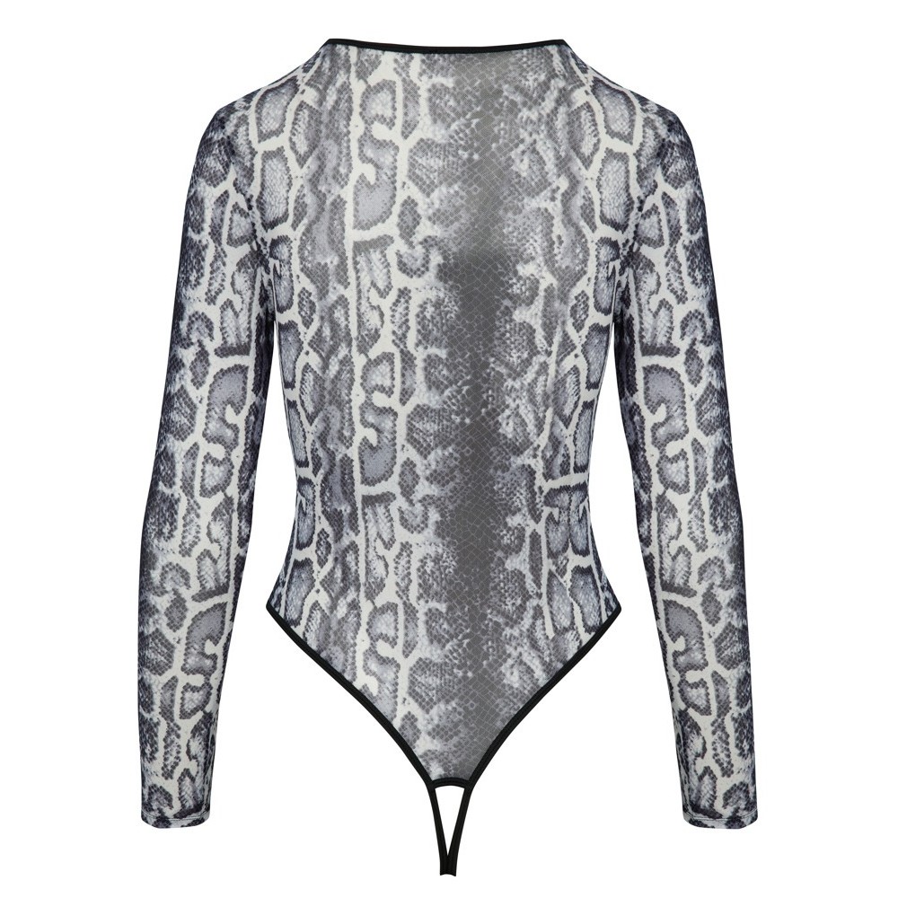 Cottelli LINGERIE — это боди без ножек с длинными рукавами и глубоким вырезом, выполненное в стиле змеиной кожи. Изготовлено полностью из тонкой прозрачной ткани с изысканным принтом. Эластичный и мягкий по всему телу для высокого уровня комфорта. Стиль стрингов с очень высокими вырезами на ногах показывает ягодицы и ноги в лучшем виде. Соблазнительно открытый в промежности.