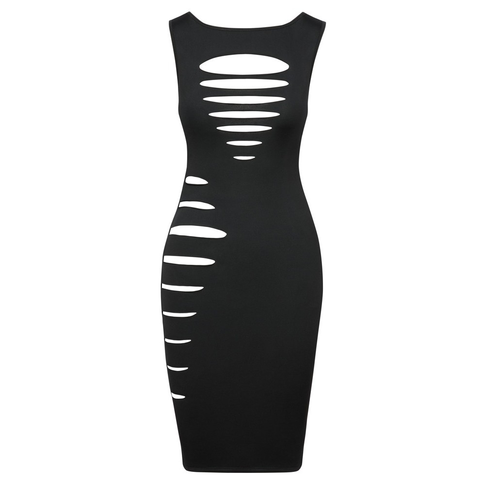 Обтягивающее платье без рукавов до колен от Cottelli PARTY, изготовленное из нежного прозрачного черного материала. С экстравагантными вырезами спереди и сбоку для возбуждающего вида. Мягкое и эластичное, очень удобно сидит.