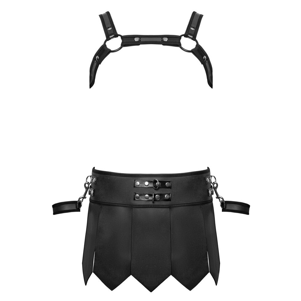 В комплект от Svenjoyment Bondage входят грудная сбруя, гладиаторская юбка и 2 наручника. Комплект изготовлен из потрясающего черного матового материала, который слегка тянется для комфортной посадки. Упряжь имеет практичные застежки для надевания и снимания. Короткая юбка имеет подлинную шнуровку сзади на поясе. Спереди и по бокам пояса прикреплены ремешки. На ремешках есть шпильки и кольца. Входящие в комплект наручники можно легко и быстро прикрепить к кольцам благодаря двойным защелкам. Мягкие наручники легко регулируются благодаря застежкам с крючками и петлями.
