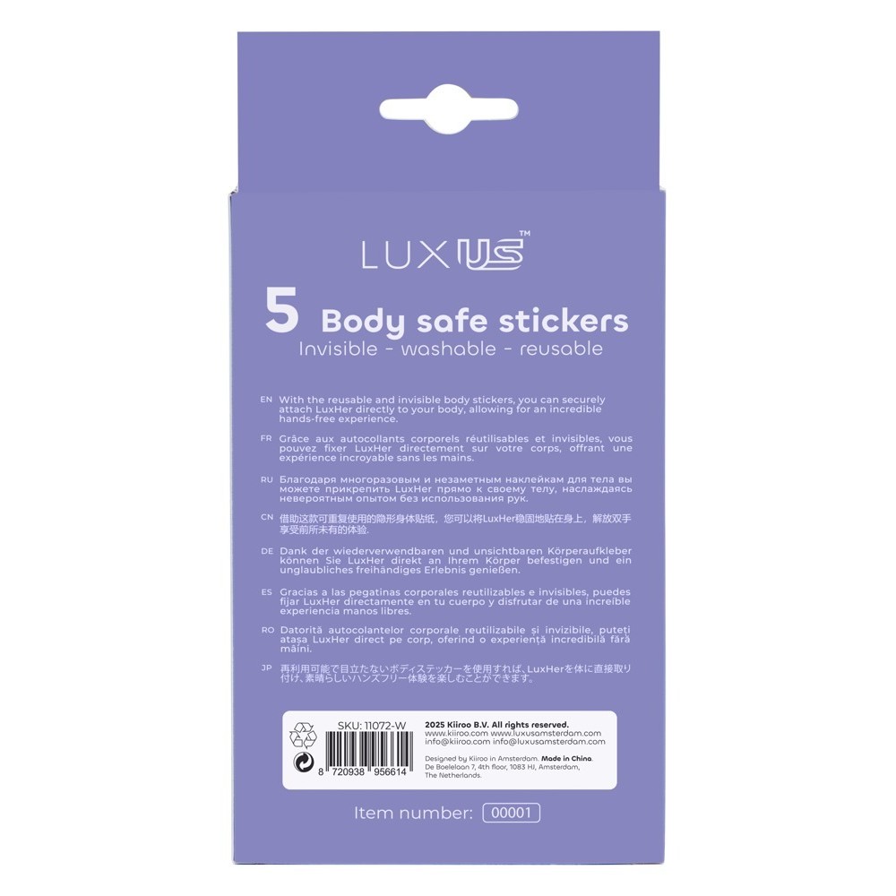 Наклейки Luxus от Kiiroo гарантируют, что клиторальный вибратор LuxHer из набора игрушек для пар Luxus останется на месте - даже в движении. Вибратор LuxHer можно прикрепить к (правильно выбритому) телу с помощью одной из клейких наклеек. Эта наклейка обеспечивает надежную фиксацию в любом положении, предотвращая соскальзывание. Приятные для кожи наклейки можно использовать многократно.