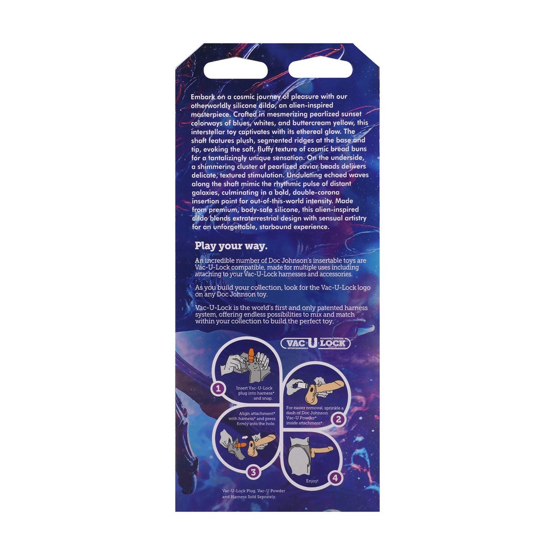 Отправьтесь в космическое путешествие за наслаждением с этим инопланетным силиконовым фаллоимитатором - шедевром, вдохновленным научно-фантастической вселенной. Завораживающие оттенки голубого, белого и кремово-желтого, он светится неземным эффектом, который соблазняет с первого взгляда. Тело имеет сегментированные мягкие бугорки у основания и кончика, напоминающие гладкую текстуру космических "булочек", что создает неповторимые ощущения.